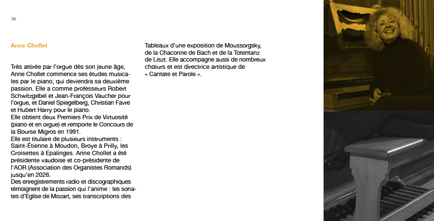 She holds several titular positions: Saint-Étienne in Moudon, Broye in Prilly, and Les Croisettes in Epalinges. Anne Chollet served as President of Vaud and Co-President of the AOR (Association of Romand Organists) until 2026.