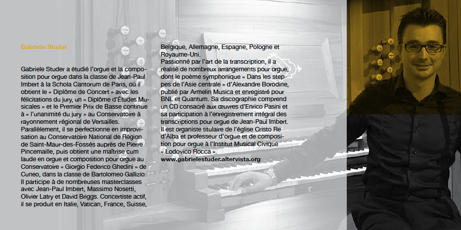 Gabriele Studer studied organ and organ composition in the class of Jean-Paul Imbert at the Schola Cantorum in Paris, where he obtained the “Diplôme de Concert” with jury honors, a “Diplôme d’Études Musicales,” and the First Prize in Basso Continuo unanimously at the Conservatoire à Rayonnement Régional of Versailles.